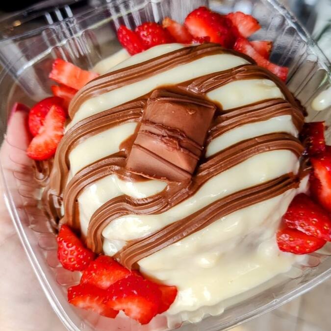 Delicioso creme de chocolate, creme três leites, brownie, morango frescos e chantininho. Pote de 500ml