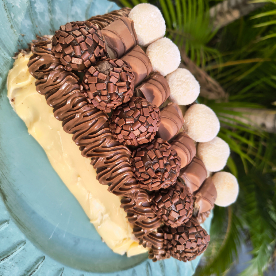 São duas camadas de brownie e duas camadas de recheio sendo: brigadeiro, Creme de Avelã e amendoim. Na cobertura um bombom ferrero e morango.