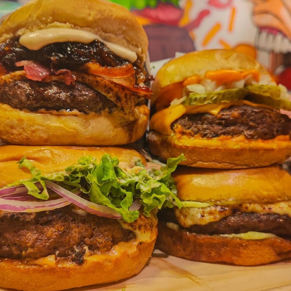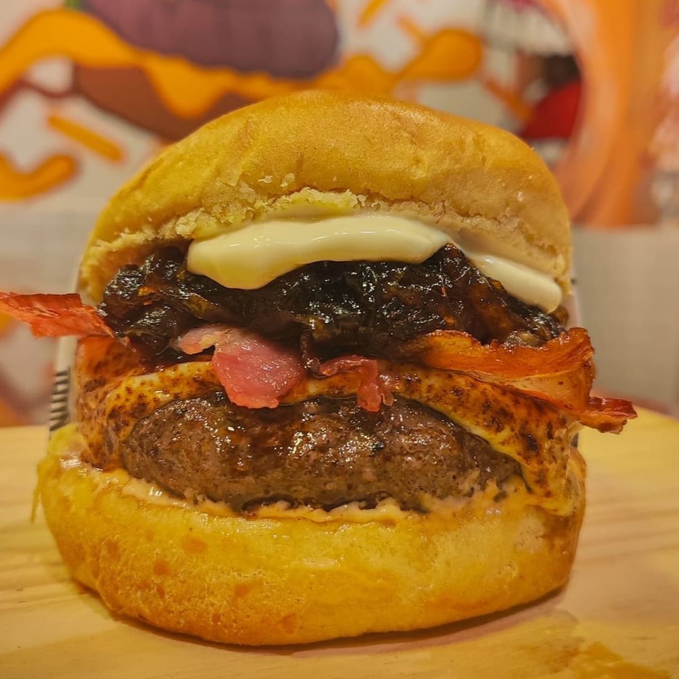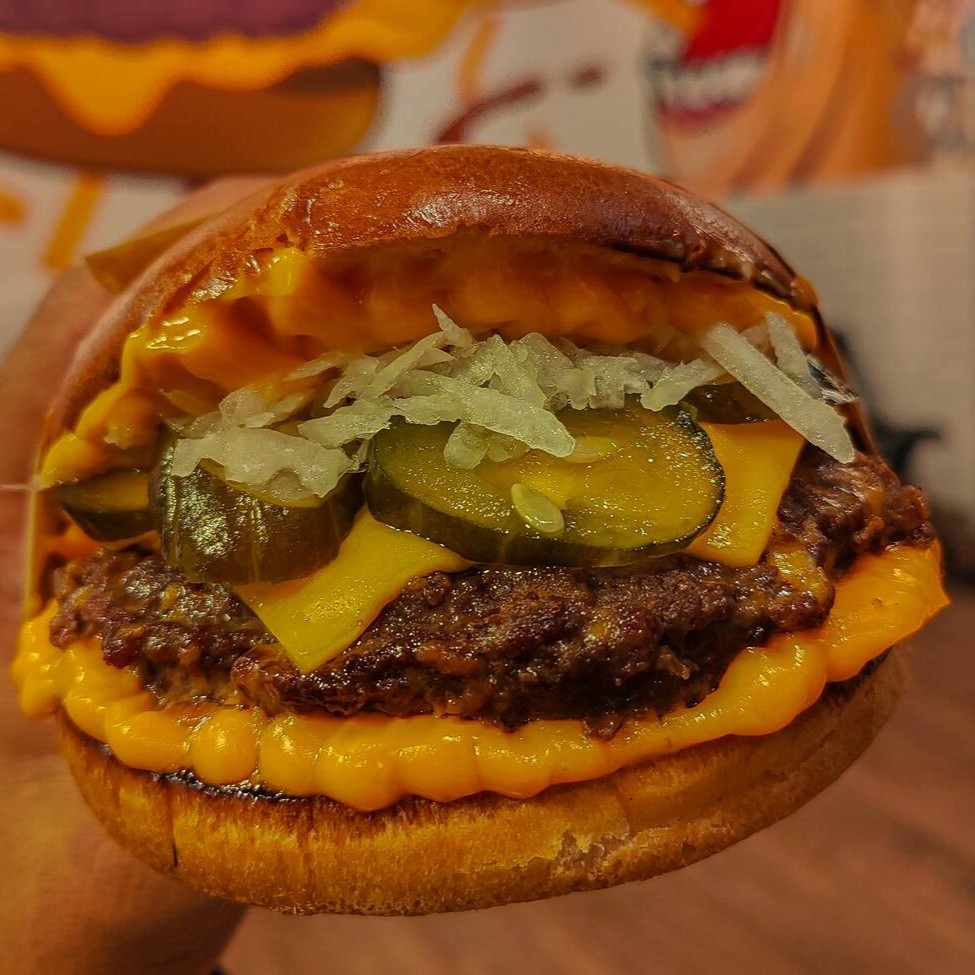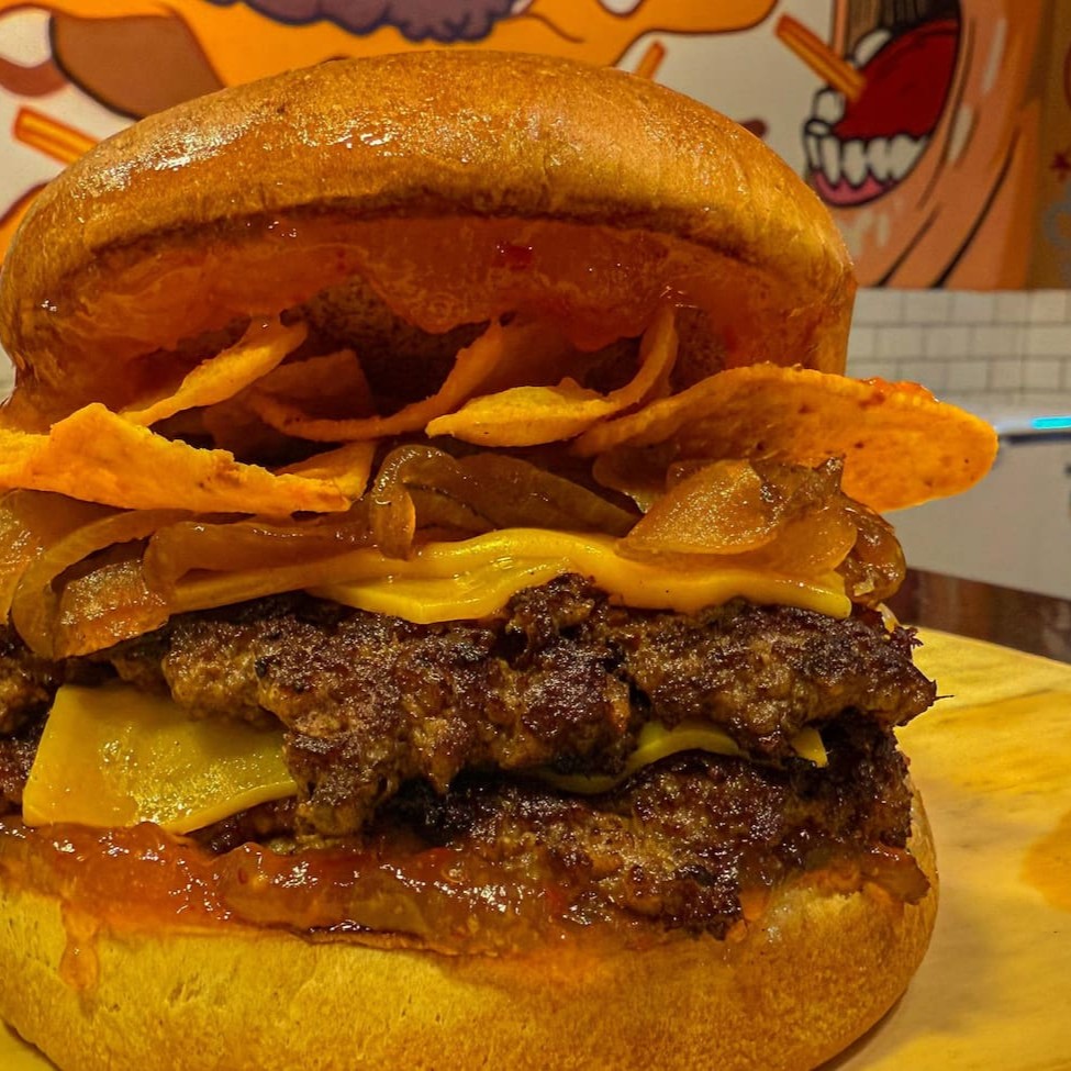 Pão de Brioche, geleia de pimenta, 2 hamburguer smash 90g cada , queijo cheddar, Doritos e cebola caramelizada.