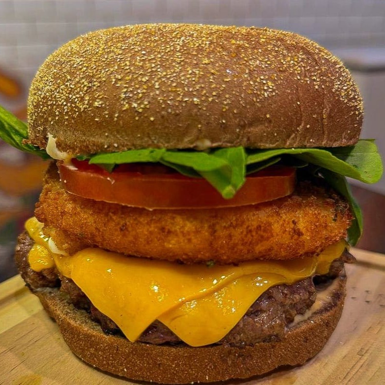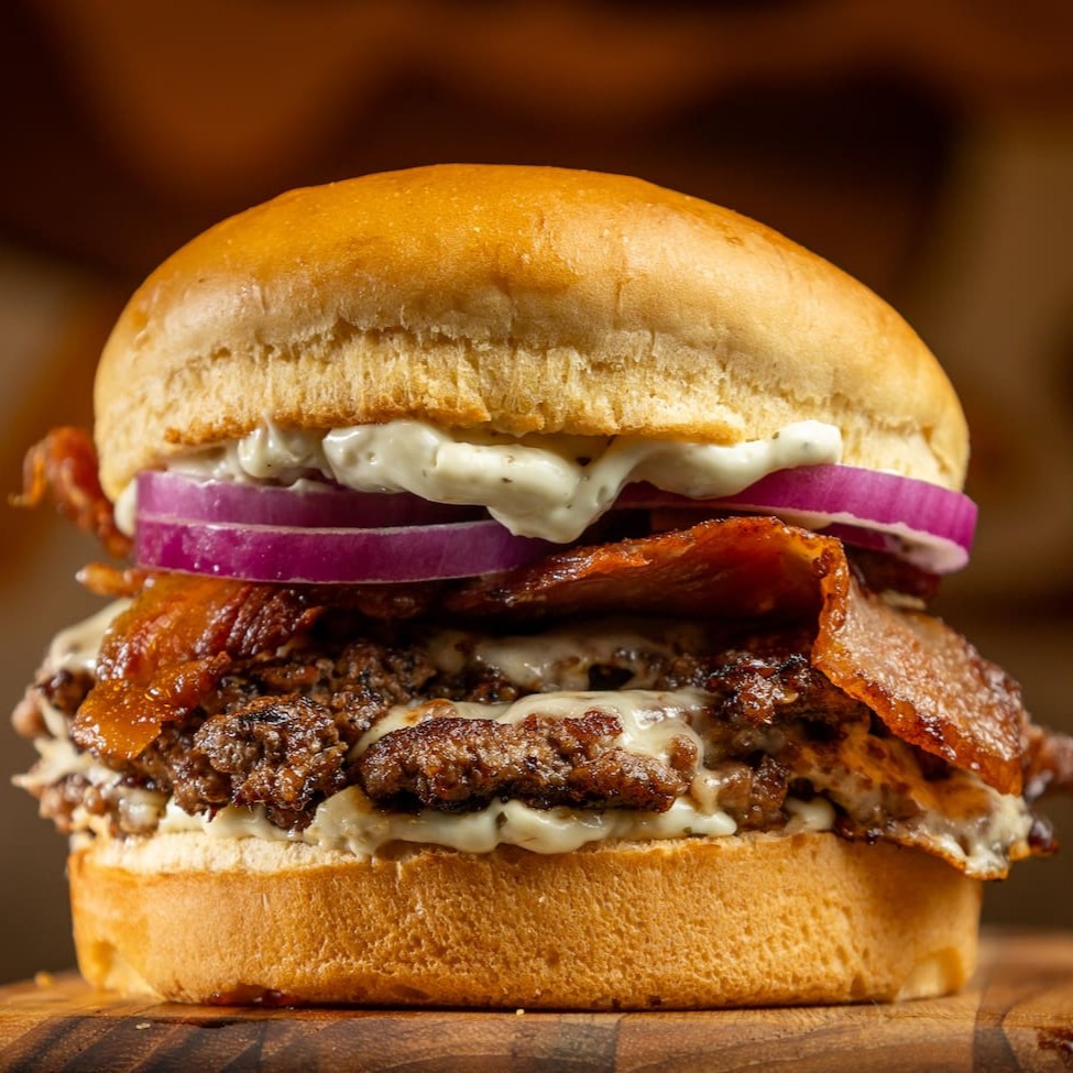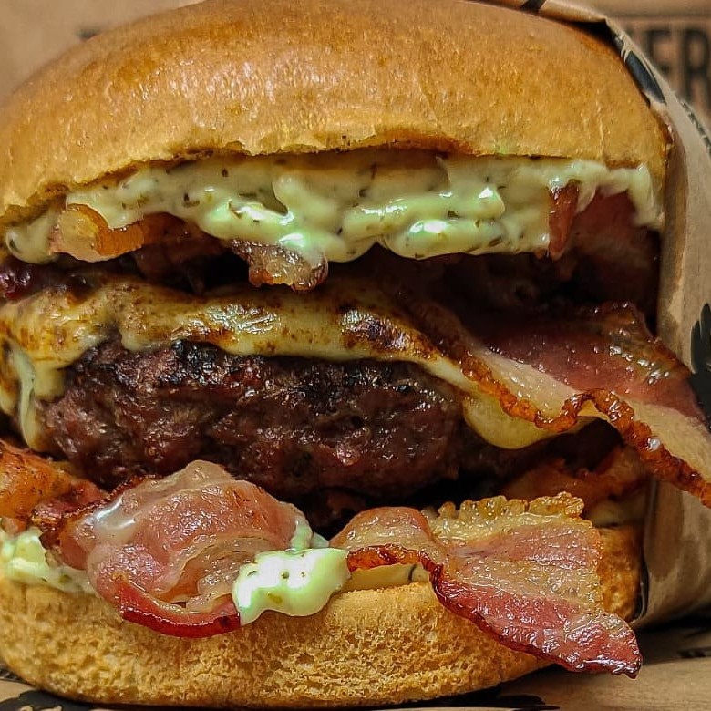 Pão de brioche, duplo smash de 90g cada, fatias de cebola roxa junto ao smash, bacon com queijo mussarela gratinado por cima e maionese da casa!