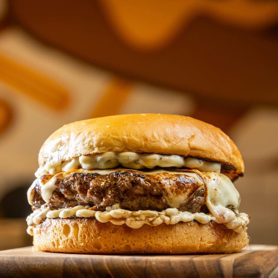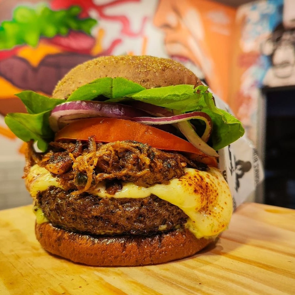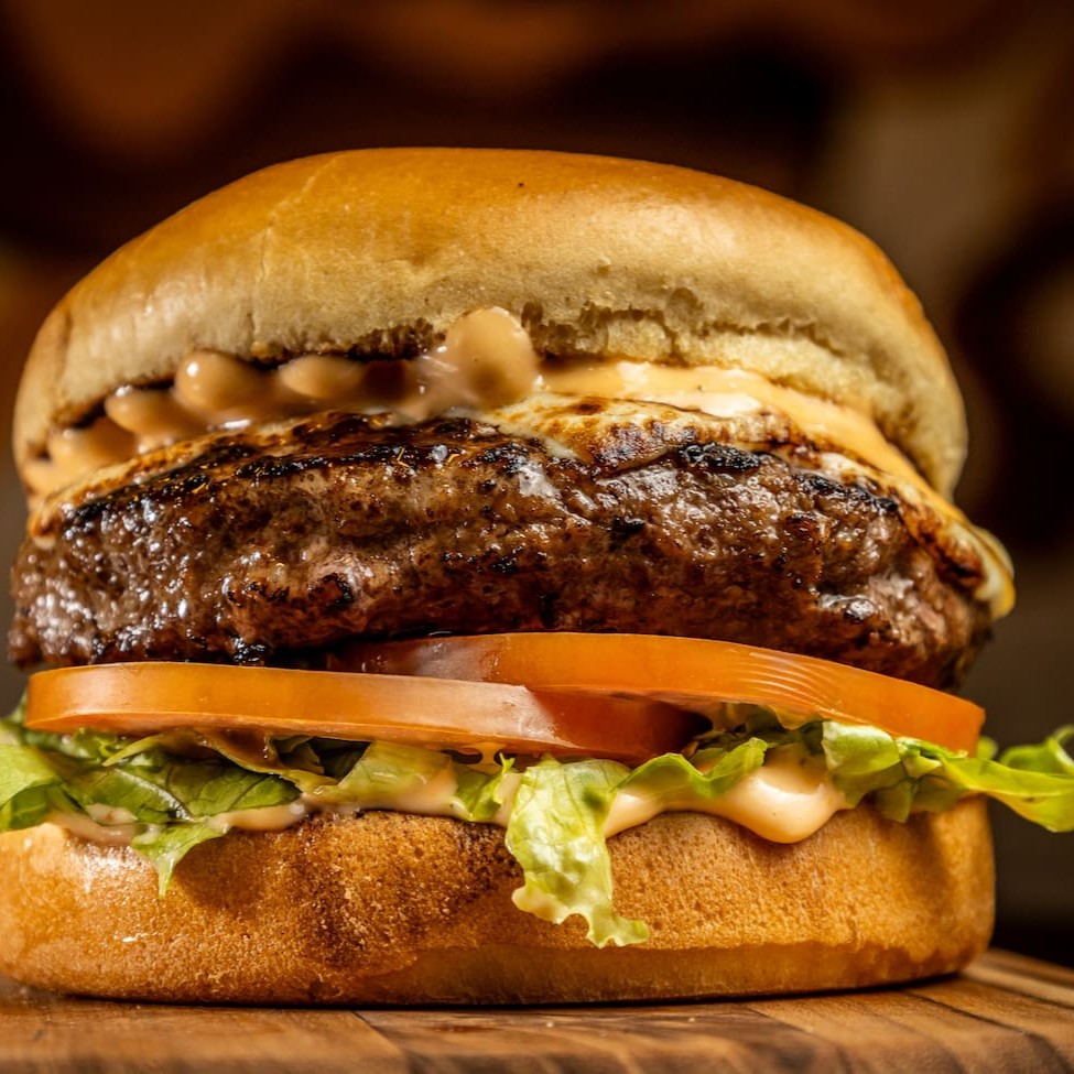 Pão australiano, hambúrguer artesanal 170g, carne de costela desfiada, queijo gratinado, cebola roxa, rúcula, tomate e maionese temperada.