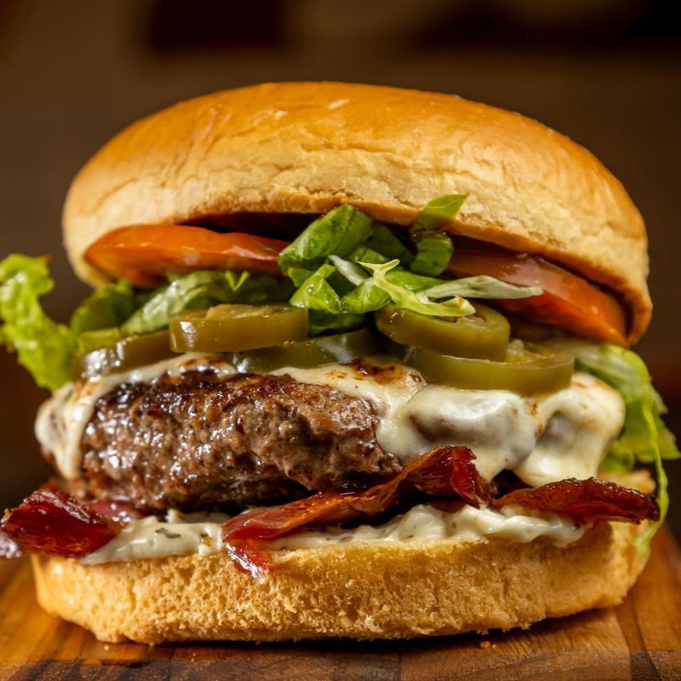 Pão de brioche, hambúrguer artesanal 170g, bacon, queijo mussarela, Alface, tomate, pimenta jalapeno e barbecue.