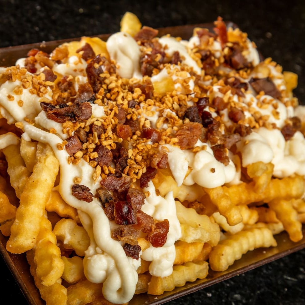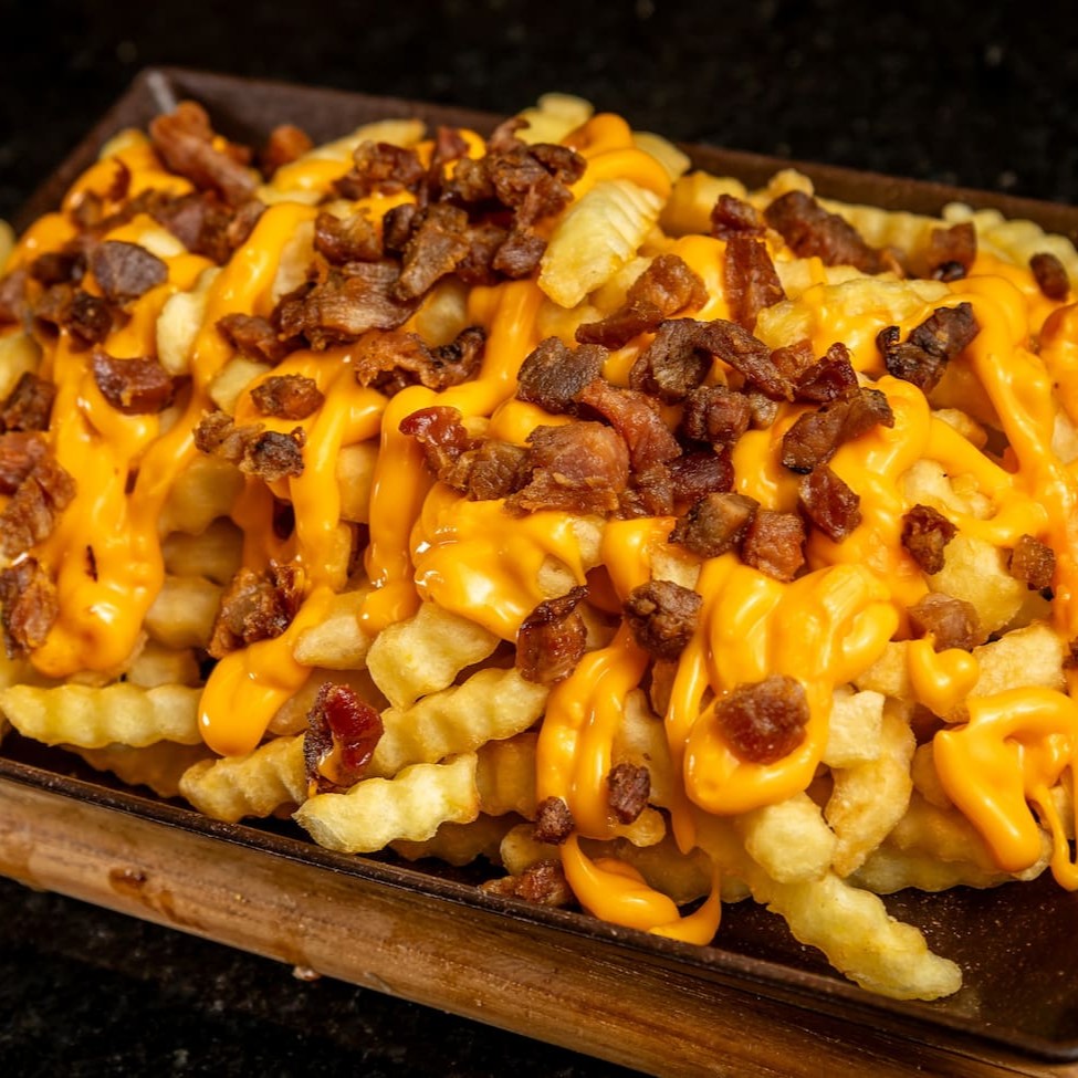 Batata Crinkle, Catupiry Original, Bacon em cubo e alho Frito