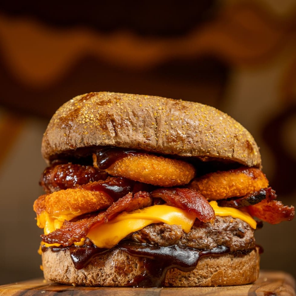Pão australiano, hamburger artesanal de 170g, queijo cheddar, bacon fatiado, onion rings e molho barbecue