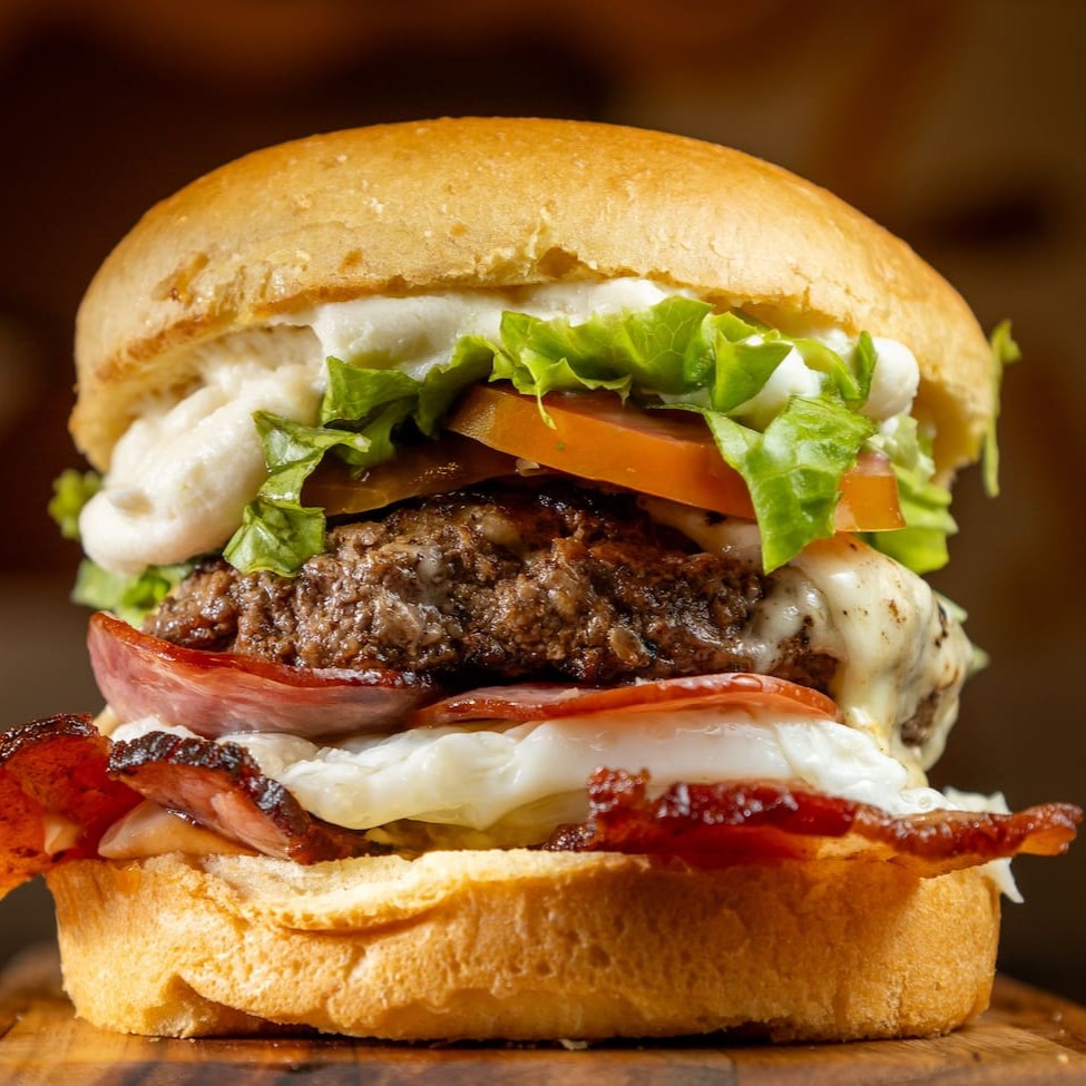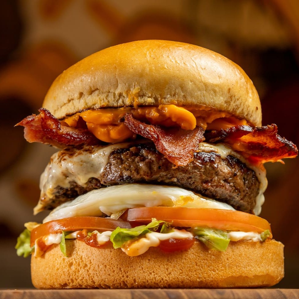 Pão de brioche, hambúrguer artesanal 170g, bacon fatiado, queijo gratinado, ovo, cheddar cremoso. Alface, tomate, ketchup e maionese Heinz.