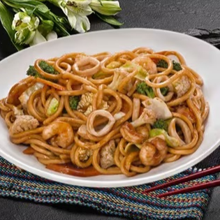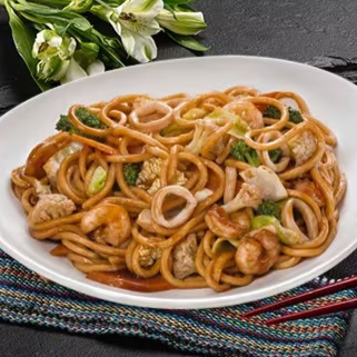 Macarrão, carne bovina, frango, legumes e molho à base de shoyu.