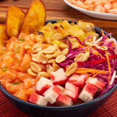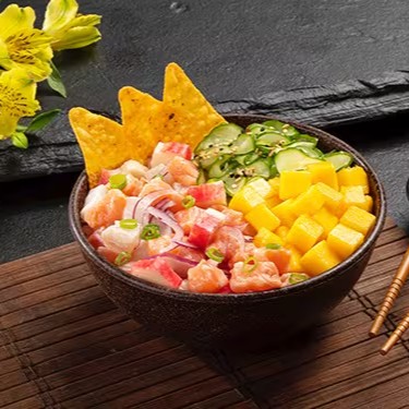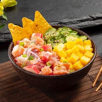 Shari (arroz japonês), ceviche, manga em cubos, sunomono, nachos e cream cheese. Poke de 340 gramas.