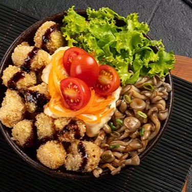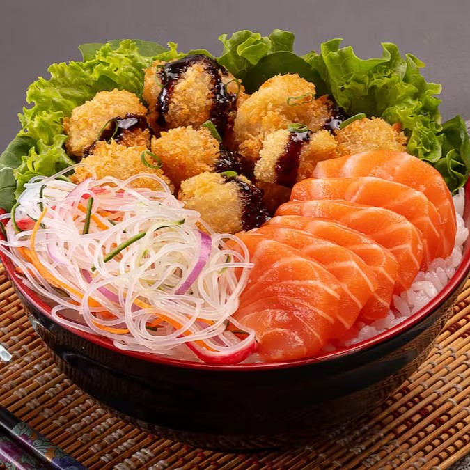 Sashimi de salmão, frango crispy, alface, shari , rucula, salada de harussame, molho tarê, molho asiatico e cebolinha fatiada. Poke de 390 gramas.