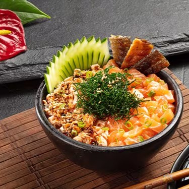 Shari (arroz japonês), salmão cru, salmão grelhado, cream cheese, skin, pepino, couve crispy e molho tarê. Poke de 360 gramas.