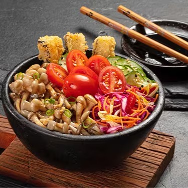Shari (arroz japonês),shimeji, berinjela crispy, sunomono, mix de salada (repolho roxo, cenoura, pimentão vermelho e molho asiático), tomate cereja e molho tarê. Poke de 370 gramas.