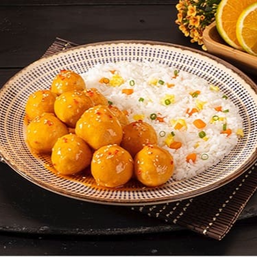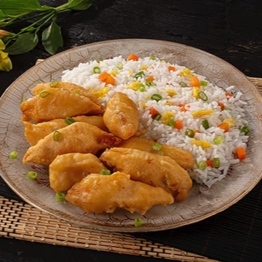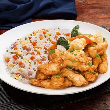 Peito de frango empanado, gengibre, pimenta, molho a base de laranja e gergelim. Acompanha arroz primavera. Executivo Frango ao Molho de laranja com 550 gramas.
