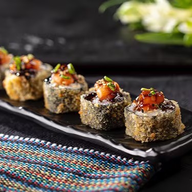 Enrolado crocante de salmão, cream cheese, kani, cebolinha e molho tarê. Hot Especial com 10 unidades.