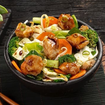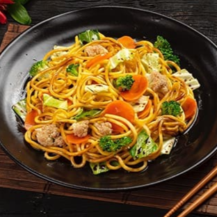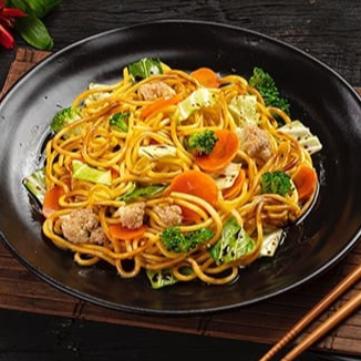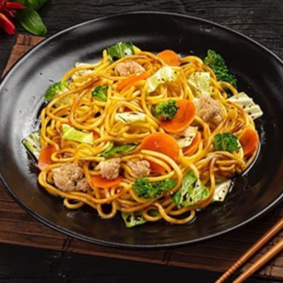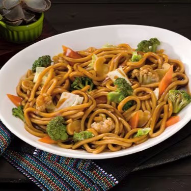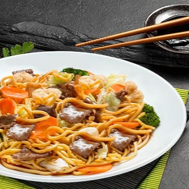 Macarrão, carne bovina, frango, legumes e molho à base de shoyu.