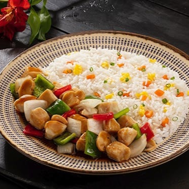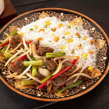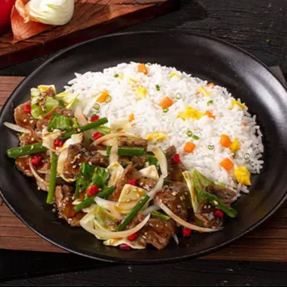 Carne Bovina, cebola, cebolinha, repolho, pimentão vermelho, gergelim, molho a base de shoyu, gengibre e pimenta, acompanhado de um delicioso arroz primavera. (Prato Levemente Apimentado)