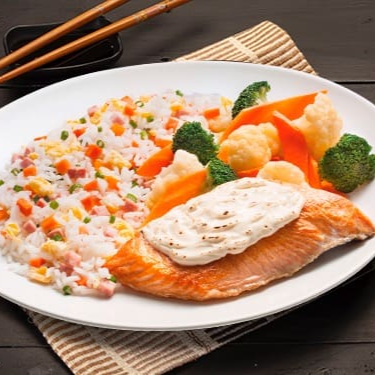 Salmão grelhado com cream cheese, legumes na manteiga e arroz primavera. Executivo de Salmão Grelhado com Cream Cheese com 450 gramas.