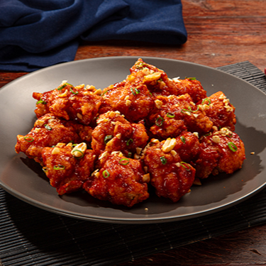 Sobrecoxa de frango empanada, pimenta coreana, cebolinha e amendoim. (Prato Apimentado)(Este Prato Não Acompanha Arroz).