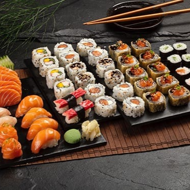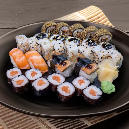 6 sashimis salmão, 4 niguiris salmão, 2 niguiris peixe branco, 2 niguiris kani, 10 hots especiais, 8 uramakis salmão, 4 uramakis salmão grelhado, 4 uramakis califórnia, 2 joes, 4 sakemakis e 4 kappamakis (este combinado não pode ter sua composição alterada).