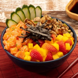 Shari, salmão cru fresquinho, shimeji ao molho tarê, manga, morango, pepino, nori, cebolinha e gergelim. Poke de 365 gramas.