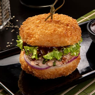 Salmão grelhado com cream cheese e cebolinha, Bolinho de shari empanado em farinha crocante, cebola roxa, alface e molho barbecue. Hot Burger de 114 gramas.