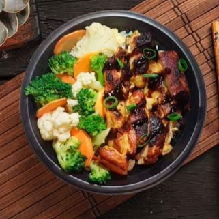 Gohan (arroz japonês), frango, legumes refogado e molho à base de shoyu. Domburi de Frango com 485 gramas.