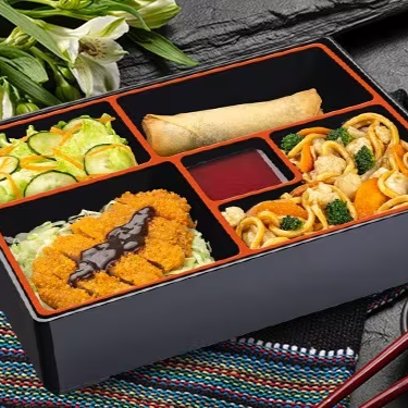 Yakisoba de legumes (macarrão, legumes à base de molho shoyu), salada (alface, pepino e cenoura), rolinho primavera e frango teriyaki. Bentô com 500 gramas.