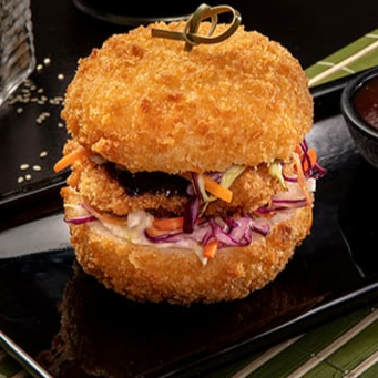 Lombo empanado em farinha crocante, Bolinho de shari empanado em farinha crocante Panko , salada (cenoura, repolho branco, repolho roxo e molho tártaro) e molho tarê. Hot Burger com 110 gramas.