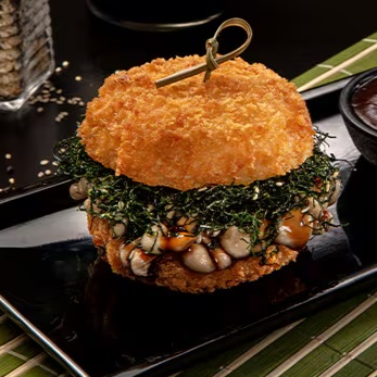Shimeji, Bolinho de shari empanado em farinha crocante, molho tarê, couve crispy e mix de gergelim. Hot Burger com 110 gramas.