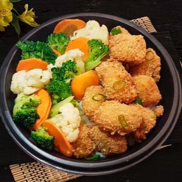 Arroz primavera, legumes na manteiga (brócolis, couve flor e cenoura), cubos de frango frito empanados em farinha crocante e cebolinha. Domburi Crispy Chicken com 450 gramas.