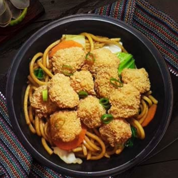 Macarrão, repolho, cenoura e molho à base de shoyu, cubos de frango frito empanados em farinha crocante e cebolinha. Domburi Macarrão Crispy Chicken com 400 gramas.