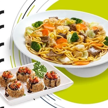 Yakisoba Tradicional 600g (macarrão, carne, frango, legumes e molho à base de shoyu) + Hot Especial (enrolado crocante com arroz, salmão, kani, cream cheese, cebolinha, molho tarê e gergelim).