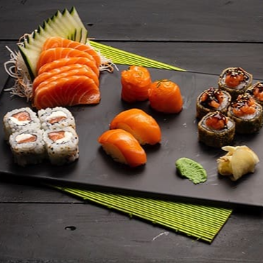 6 sashimis salmão, 2 niguiris salmão, 2 joes, 4 uramakis salmão e 5 hots especiais (este combinado não pode ter sua composição alterada).