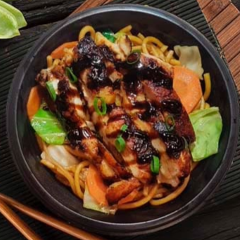 Macarrão, repolho, cenoura e molho à base de shoyu, filé de coxa grelhada coberta com molho tarê e cebolinha. Domburi Macarrão Tarê Chicken com 400 gramas.