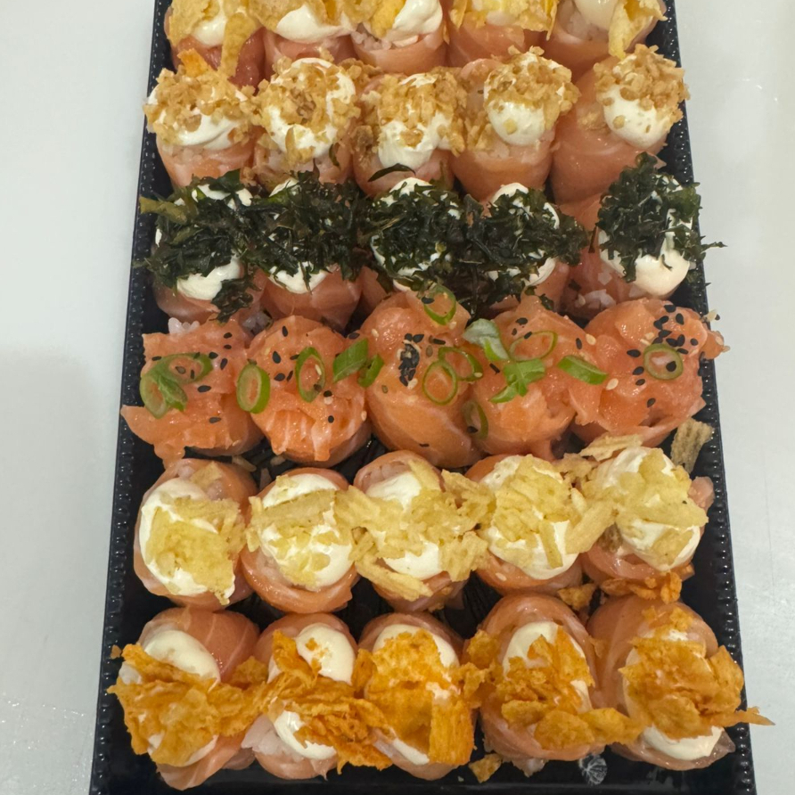 Um delicioso combo só salmão todos os sushis de salmão pronto pra você saborear com 8 sashimis de salmão,4 jhous de salmão,4 niguiri de salmão, 4 uramaki salmão , 4 hosomaki de salmão só salmão e fresquinho!!