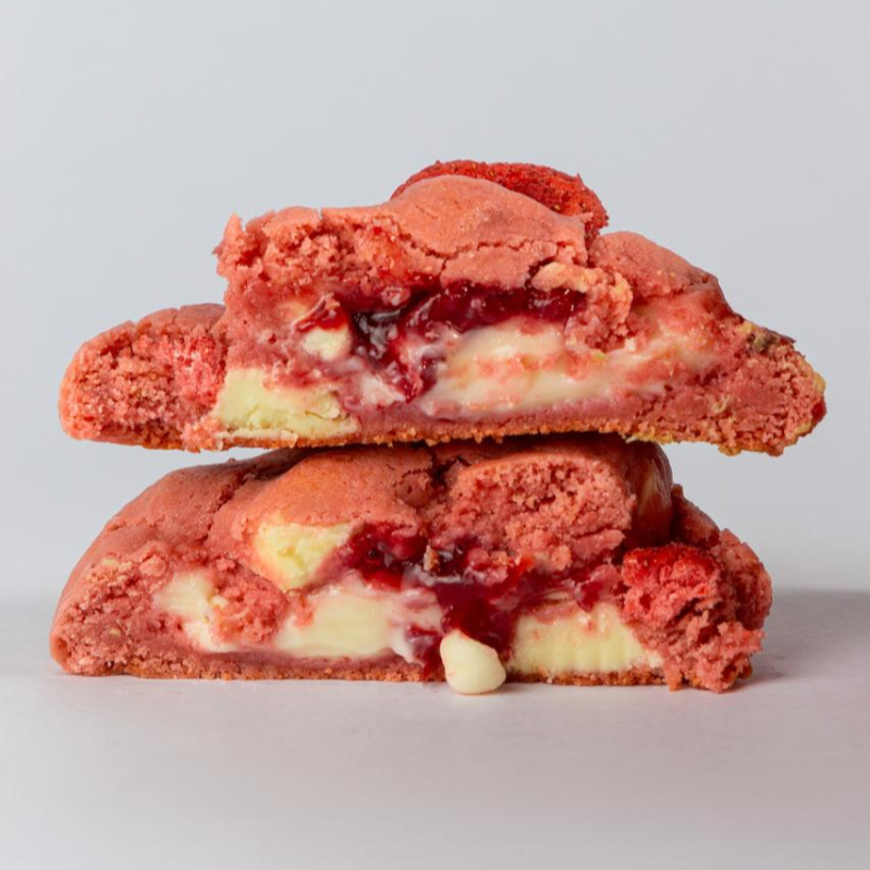 Um cookie que parece uma sobremesa: recheio cremoso de cream cheese com geléia caseira de morango massa tradicional com chocolate branco, finalizado com morango liofilizado.