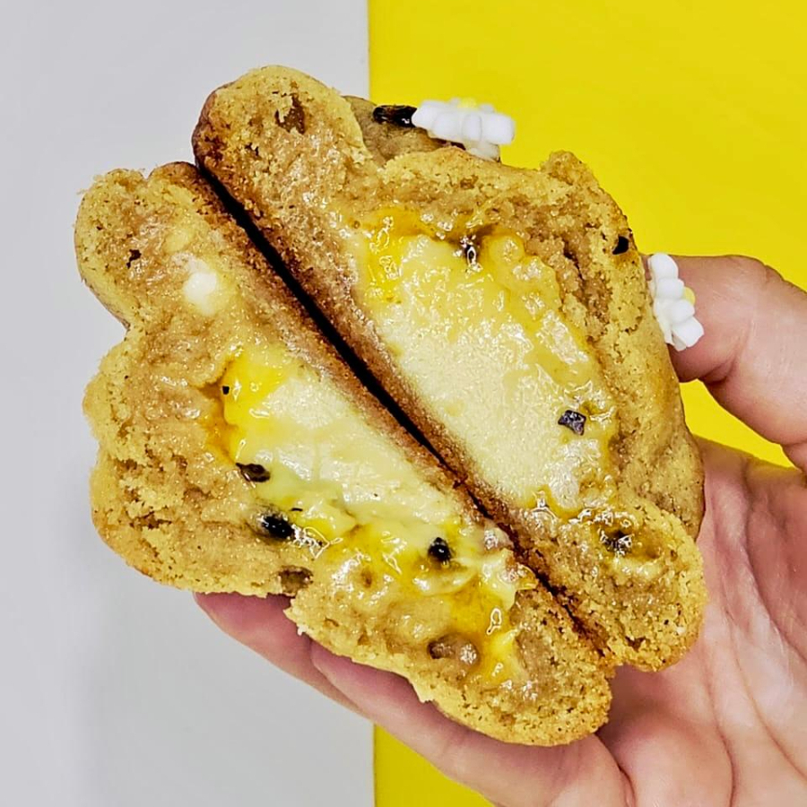 Massa tradicional com chocolate branco, recheada com creme de maracujá e geleia caseira. Textura cremosa, acidez delicada e sabor que remete ao mousse caseiro clássico, aquele de memória afetiva, simples, fresco e absolutamente irresistível.