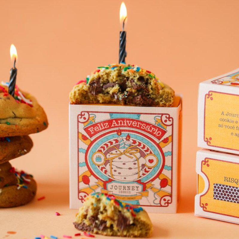 Um cookie classico com pedaços de chocolate ao leite, finalizado com granulados coloridos para deicar a celebração ainda mais especial. Acompanha caixa decorada, vela e fósforo que acende na propria caixa.