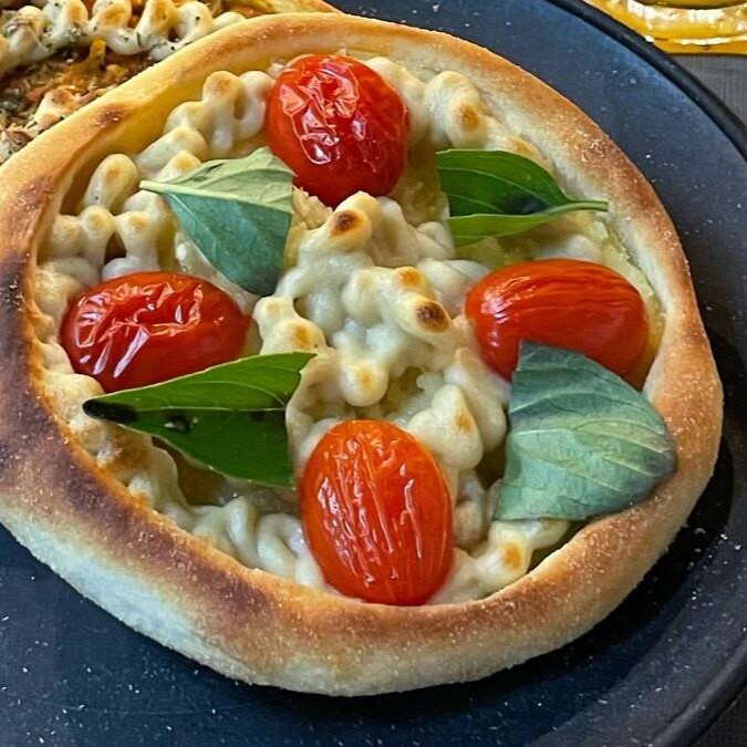 Molho de tomate, muçarela veg, pesto de manjericão e tomate cereja