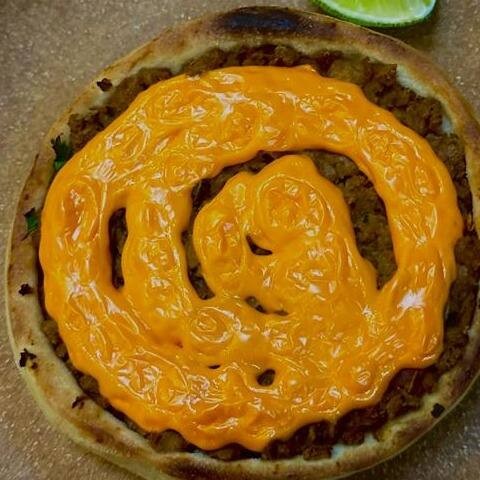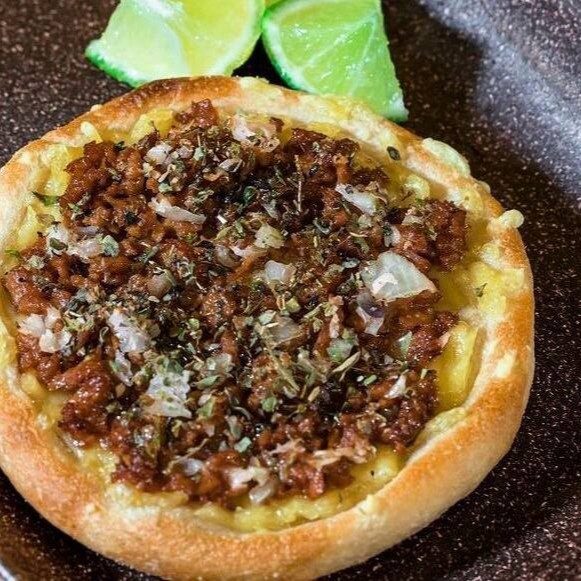 Proteína de soja temperada, tomate, cebola, azeitona, salsinha e cheddar vegano