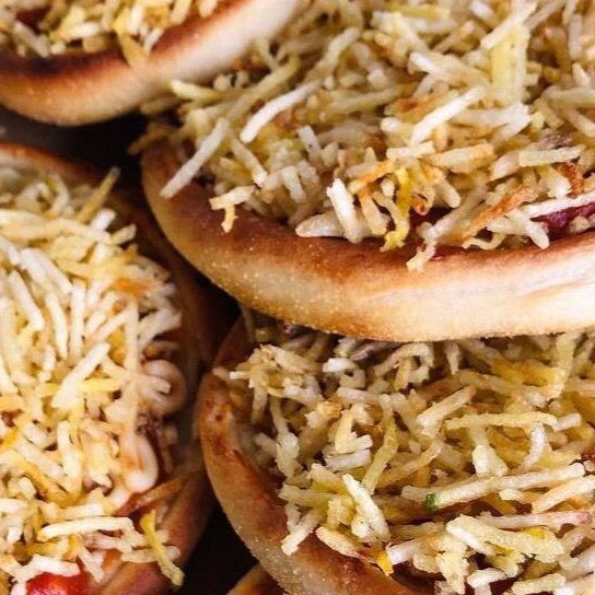 Purê de batata, salsicha de soja, molho de tomate, alho, Catupiry de castanha de caju e batata palha