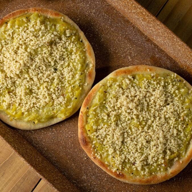 Molho de tomate, mussarela veg, calabresa de soja vegana, cebola e orégano