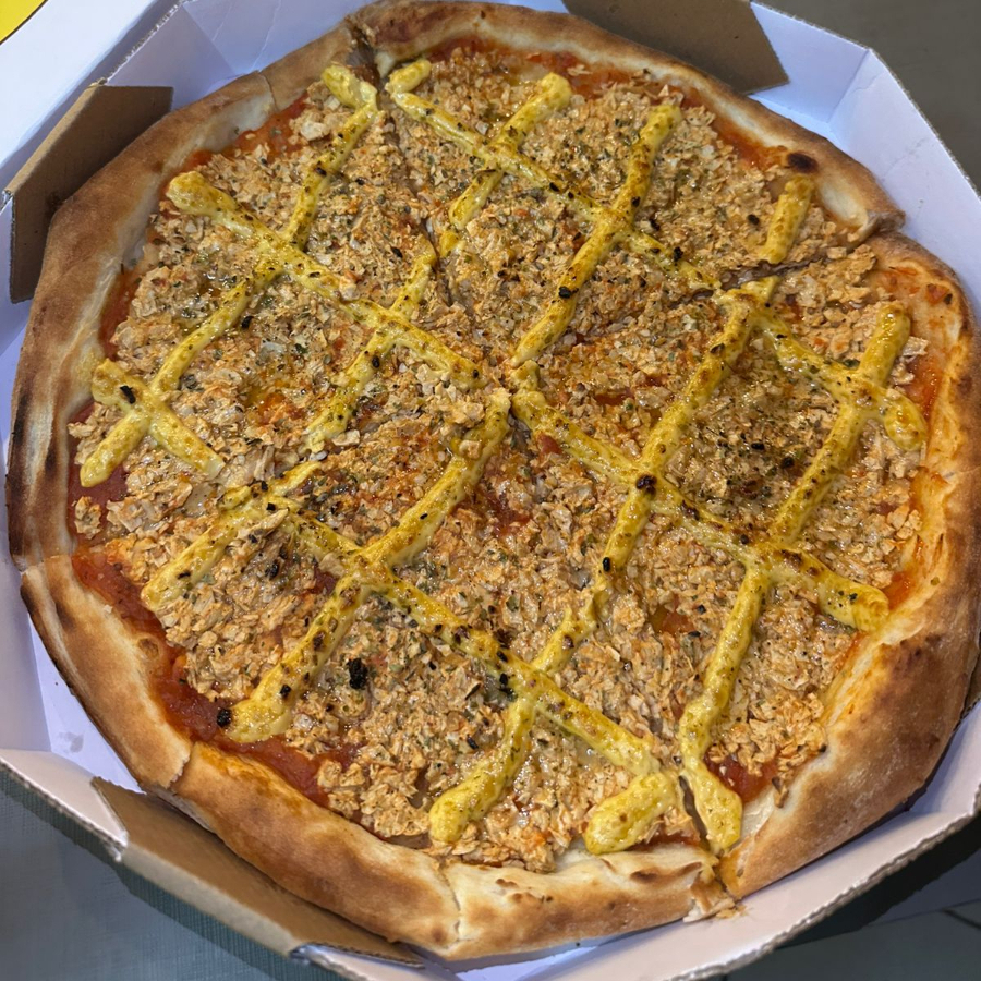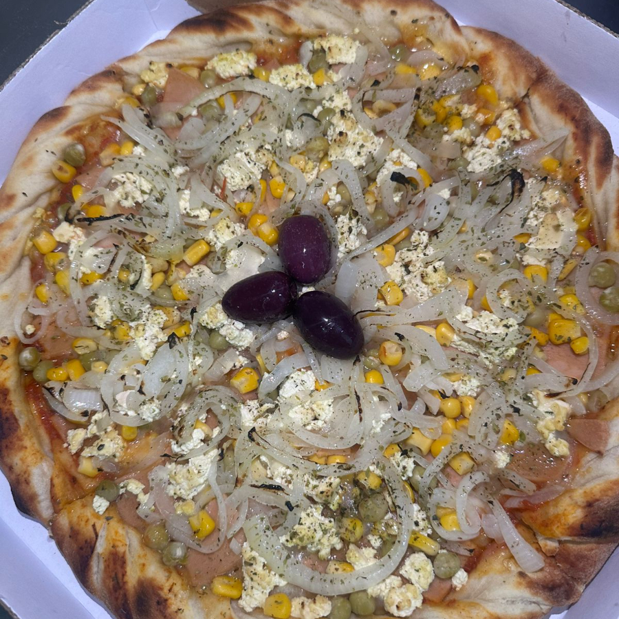 Molho de tomate, mussarela veg, presunto vegano defumado, milho, ervilha, tofu, cebola e orégano