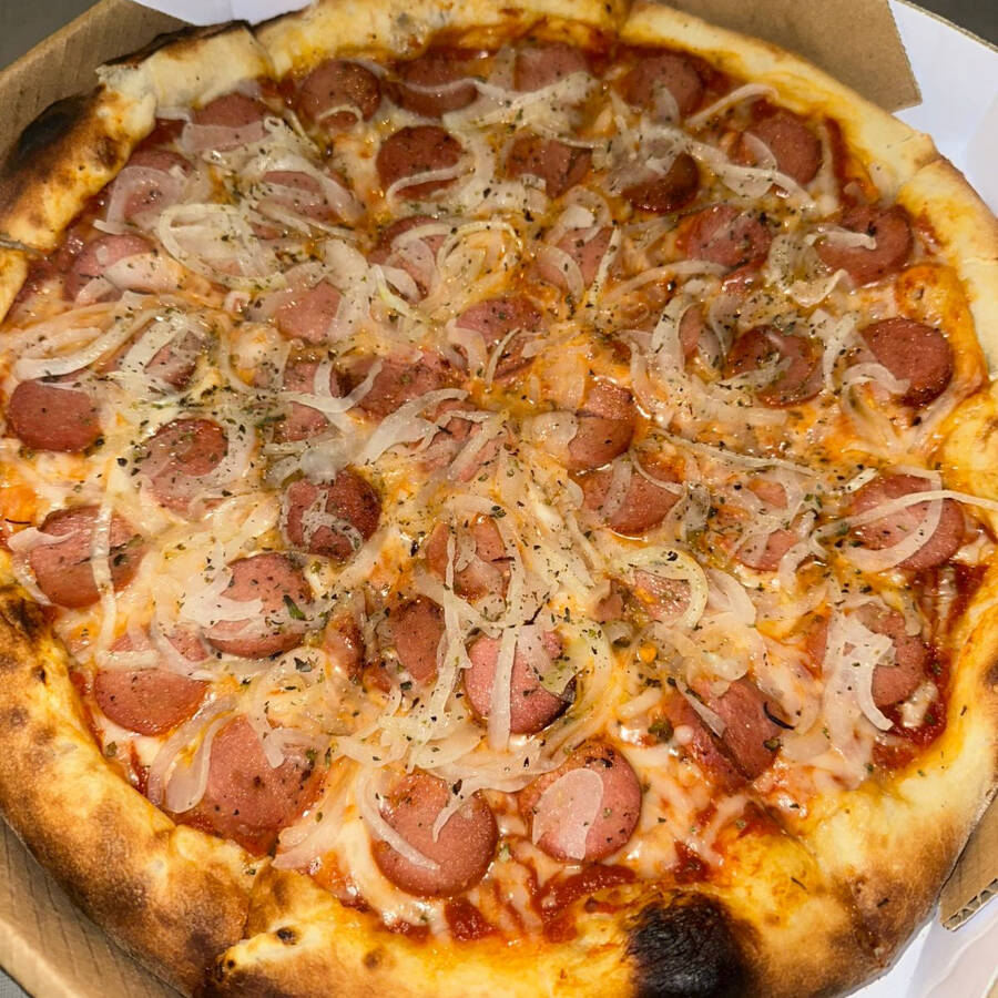 Molho de tomate, muçarela veg, calabresa de soja vegana, cebola e orégano