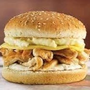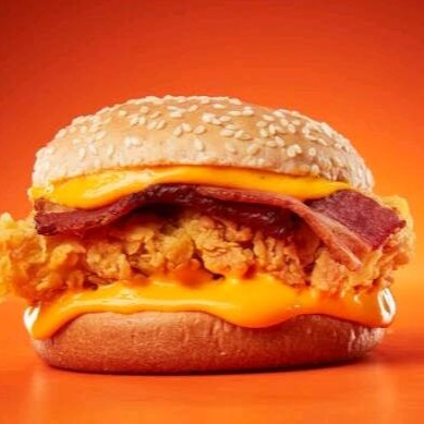 Pão de hambúrguer, filé de frango, bacon e cheddar