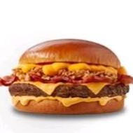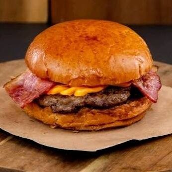 Pão de hambúrguer, hambúrguer tradicional de 90 gramas, presunto, bacon e cheddar+ batata frita P grátis