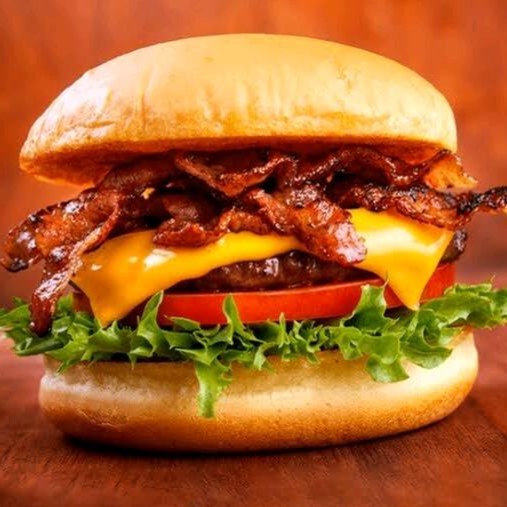 Pão de Hambúrguer, hambúrguer de 90 gramas , presunto,bacon, mussarela,tomate e alface+ Batata frita P grátis