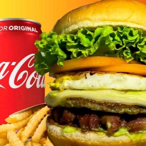 Pão de hambúrguer, hambúrguer tradicional de 90 gramas, queijo, presunto,salsicha, linguiça calabresa,ovo, requeijão cremoso, alface, tomate + coca 350 ml + batata frita P