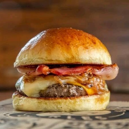 Pão de hambúrguer, hambúrguer artesanal de 200 gramas, queijo, bacon,presunto e batata frita P grátis