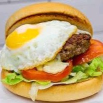Pão de hambúrguer, hambúrguer tradicional de 90 gramas, ovo e presunto + batata frita P gratis