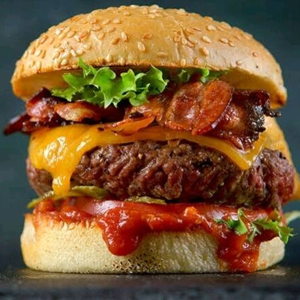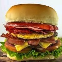 Pão de hambúrguer, 2 hambúrguer tradicional de 90 gramas, mussarela, presunto ,tomate e alface,ovo,bacon, salsicha frita, calabresa frita ,milho e requeijão cremoso + Batata frita P grátis