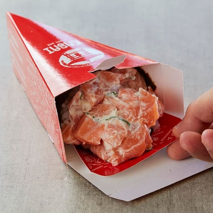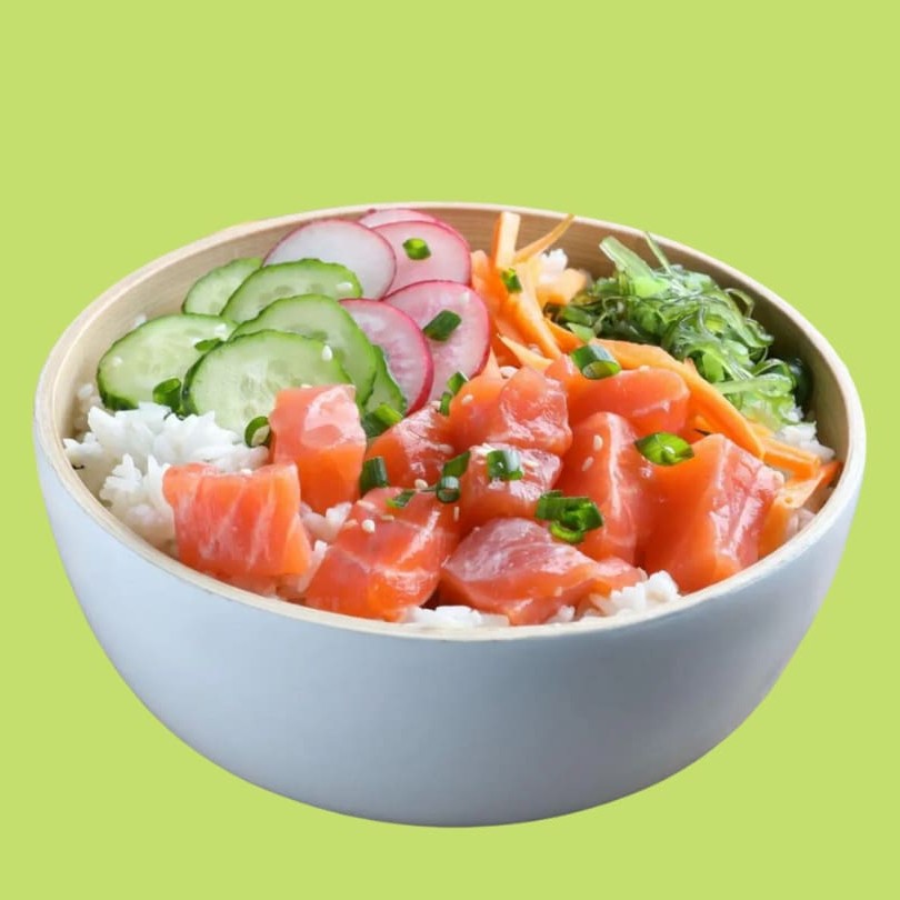 Salmão fresco, rúcula, lascas de kani, tomate cereja, gergelim torrado e suco cítrico